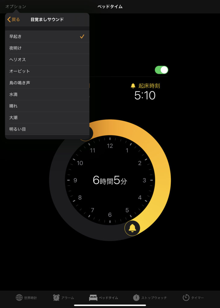 私はipadに入っている「早起き」というサウンドを低めの音量で設定しています。